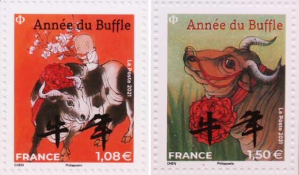 法国邮政公司发行的牛年邮票,牛背上的小童以中国年画娃娃为原型,垂首作祈祷状,象征为大家祈福。
